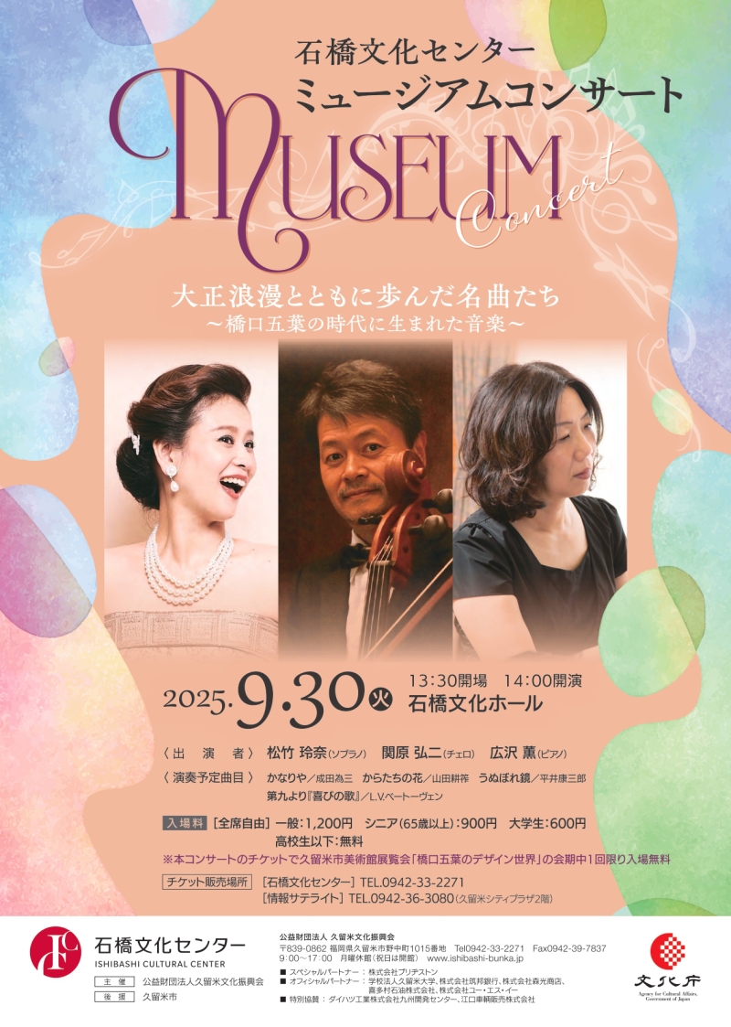 一般 1,200円 シニア(65歳以上) 900円 大学生 600円 高校生以下無料 本コンサートのチケットで「橋口五葉のデザインの世界」入場無料
